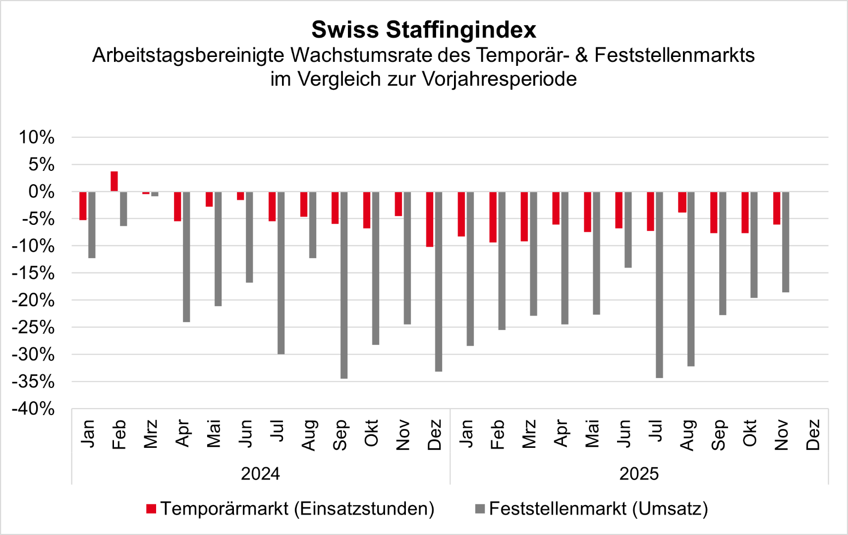 Im November bleibt der Temporärmarkt negativ, erholt sich aber leicht. Mit einer Abnahme von 3,6% Prozent gegenüber dem Vorjahr wird das Minus im Vergleich zu den Vormonaten kleiner. Das Feststellengeschäft verzeichnet weiter drastische Rückgänge. Um 24,5% schrumpfte der Markt im letzten Monat. Die roten Zahlen spiegeln die Konjunkturabkühlung gepaart mit anhaltendem Fachkräftemangel wieder.