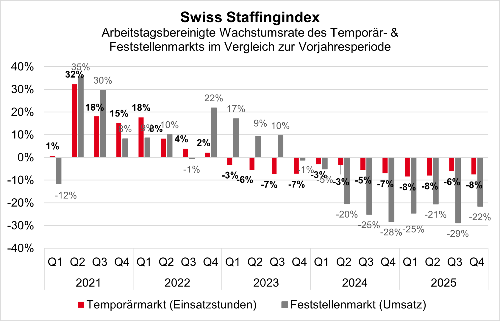 Swiss Staffingindex: Temporärmarkt verharrt im Minus